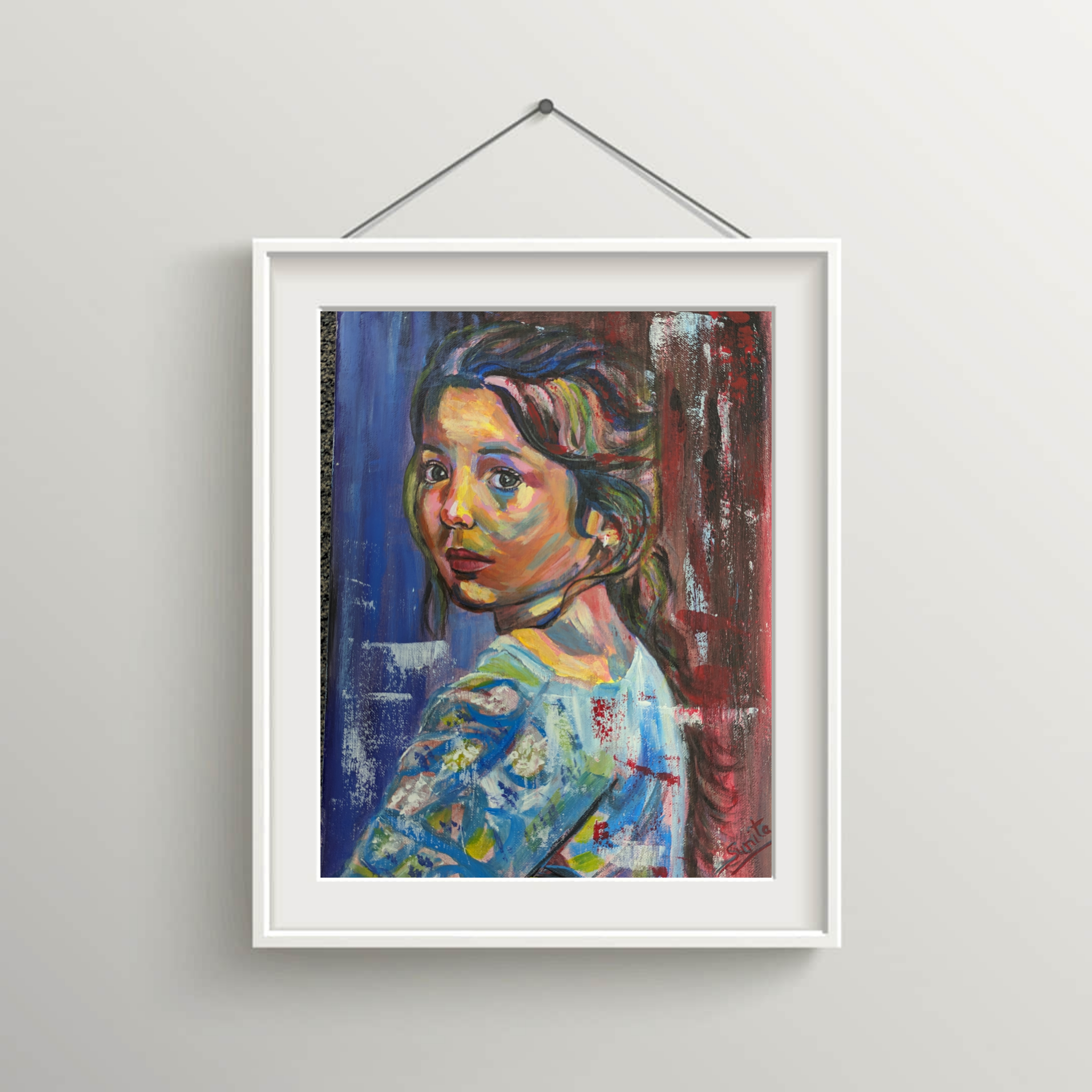 “Her eyes hold a thousand unspoken stories, gazing beyond the canvas into the soul of the viewer. Each brushstroke is alive with color — a dance of light and shadow, innocence and strength. ‘The Gaze’ is not just a portrait, but a conversation between the seen and unseen, where beauty meets mystery.”
