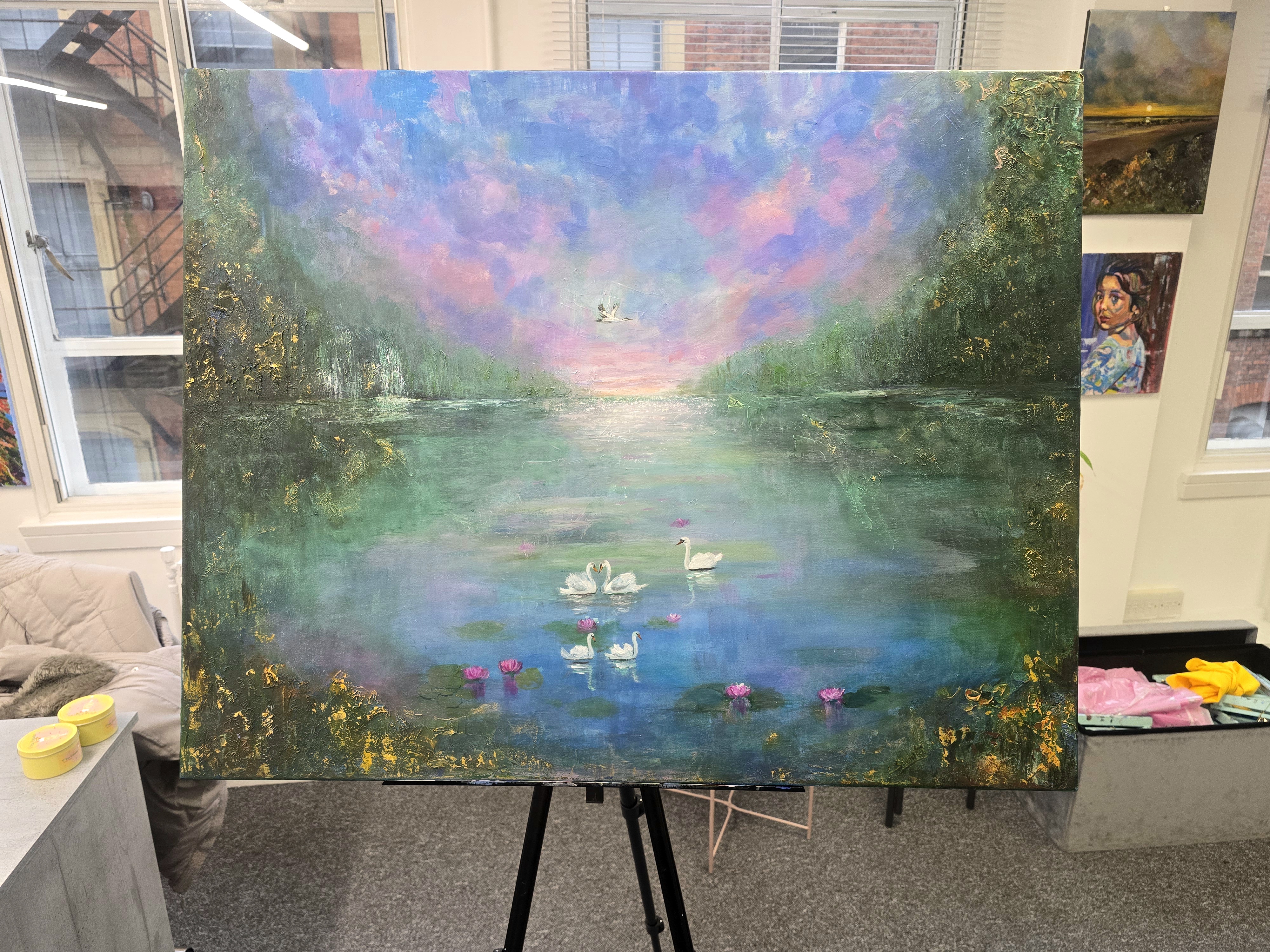 This large original artwork captures a peaceful moment at sunset, where soft pink and lavender skies reflect gently across a tranquil lake. A graceful family of swans glides through the water, surrounded by delicate lotus flowers, creating a sense of harmony, love and quiet reflection.
