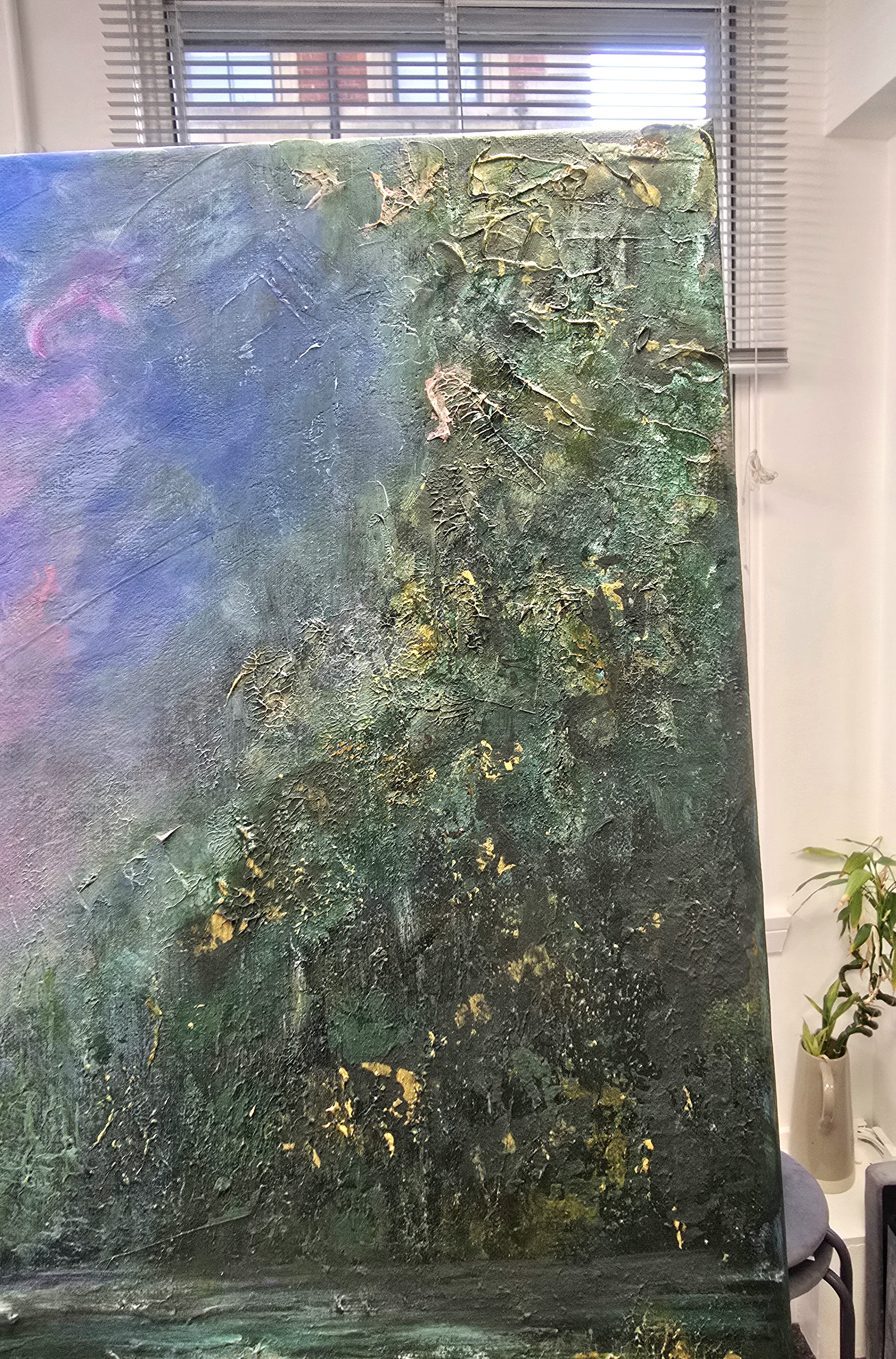 Painted in acrylic on a 80 × 100 cm stretched canvas, the artwork features rich textures and subtle gold accents that catch the light beautifully. Layers of colour and expressive brushwork create depth and atmosphere, making the scene feel both dreamy and immersive.